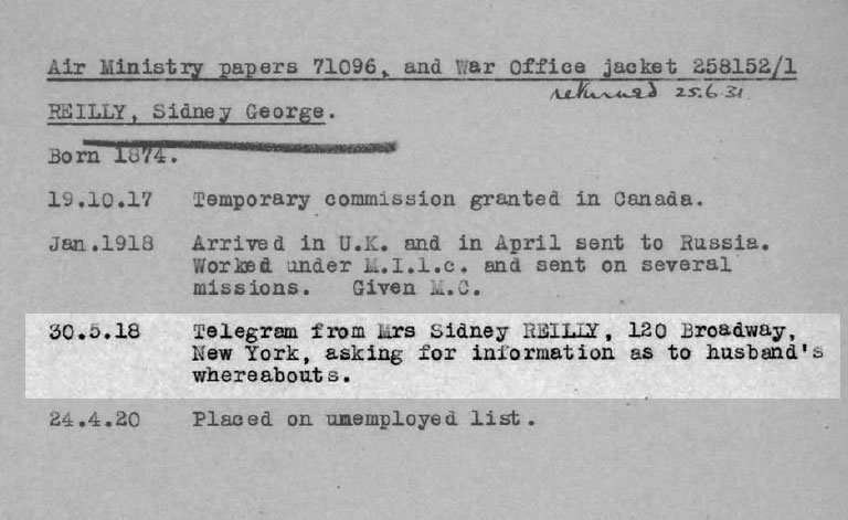 [25] US Bureau of Investigation/ Office of Naval Intelligence Report, 17 October 1918; Ace of Spies: The True Story of Sidney Reilly, Andrew Cook, History Press, 2011, p.134