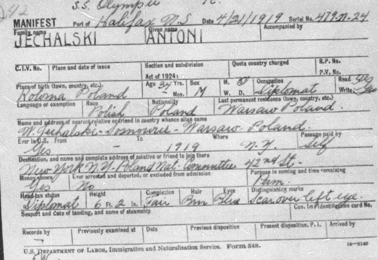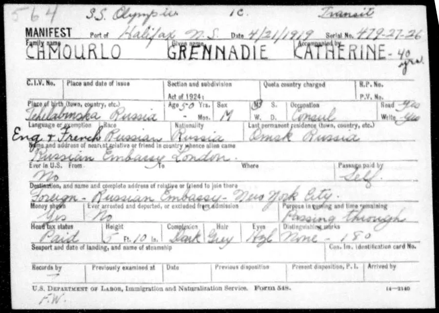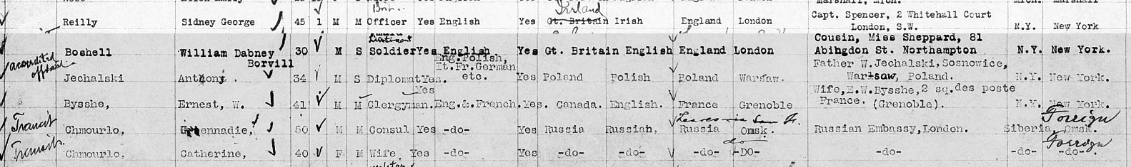 Ship manifest dated 19th April 1919 showing Sidney Reilly travelling with Omsk Representative Grennadie Chmourlo and Anthony Jechalski to New York