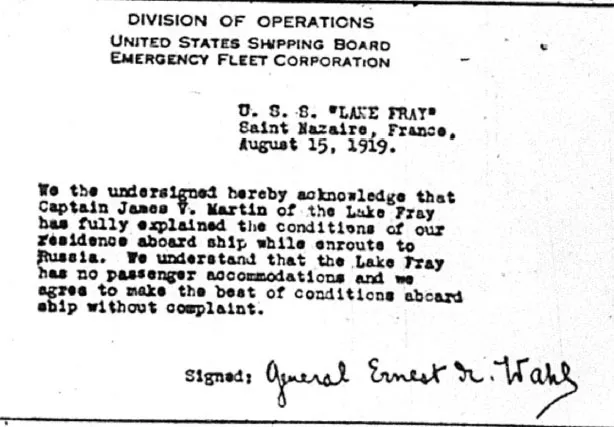 During his mission, Martin, by his own admission, says he had been forced to commit two serious offences. The first was to have consented to a request from Herbert Hoover and E.C Tobey of the A.R.A in London to ferry Imperial Russian General Major ‘Ernest von Wahl’ from Paris to Reval. Worrying that this was a violation of shipping board law, Martin says that he sought formal assurance from his superiors before accepting the passenger. Martin showed Senate and the Press a signed letter from Wahl acknowledging that he was accepting special passage.[65] Martin’s second offence was to have purchased planes and heavy artillery from Germany.