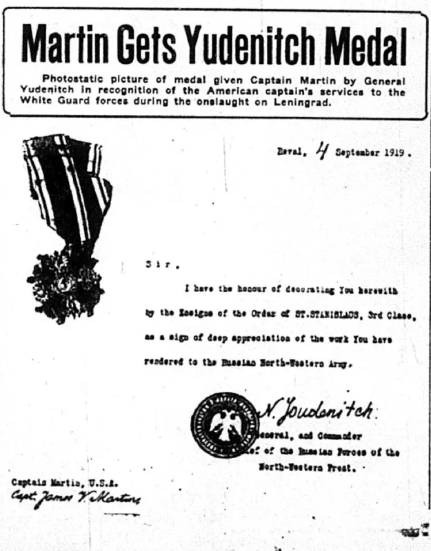 On landing successfully in Reval well ahead of schedule in September 1919, Martin claims that he was decorated by Yudenich and presented evidence to this effect at US Senate hearing some three years later. The evidence consisted of an Order of St Stanislaus medal, 3rd Class, an accompanying letter, dated September 4th 1919 as well as the landing bill receipt which listed the full contents of the Captain’s hold. Martin also provided Congress with copies of the official cables sent by Hoover’s aide de camp, Major Newman Smith, from London to Bordeaux, France, changing the assignment of this vessel and the cargo which it had on board. [64]