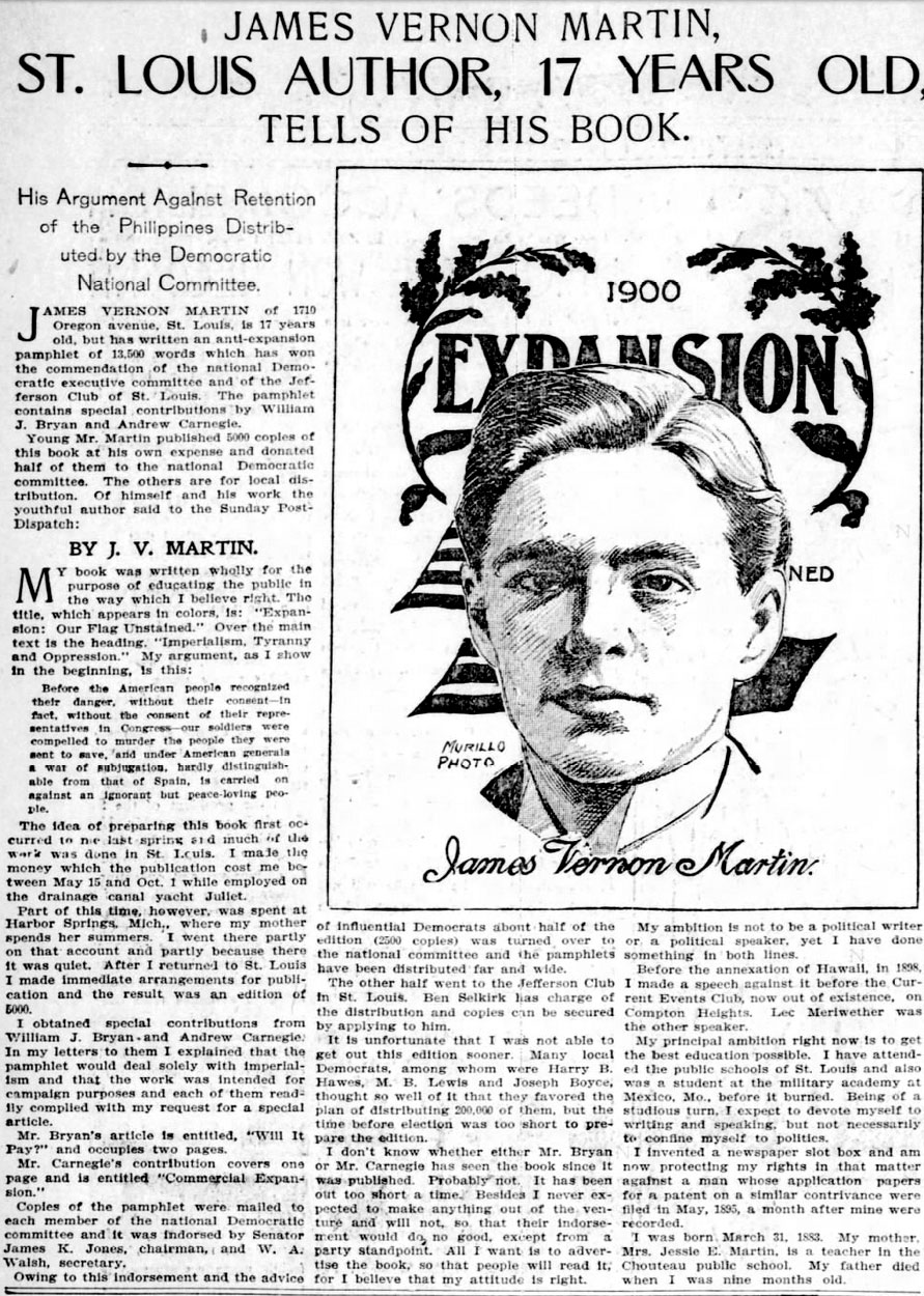 In 1900, the 17-year old Martin had self-published a pamphlet that not only earned the full support and approval of the National Democratic Committee but also featured contributions from US-Scottish Industrialist, Andrew Carnegie and Senator William Jennings Bryan. The pamphlet, ‘Our Flag Unstained: Imperialism, Tyranny and Oppression’ provided a 13,500 word challenge to the US annexation of the Philippines (1898) and its arguments found favour with the Anti-Imperialist League, of which Carnegie and Bryan were both members.