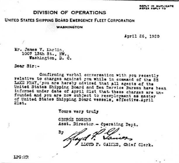 After explaining the nature of the rules he had breached, Martin went on to describe how the A.R.A thought it unwise to let him return to London where he might provide evidence to the US Shipping Board. Hoover’s response was to relieve Martin of his command of the ship. He says Hoover did this by setting him up on false charges and publically disgracing him for negotiating private sales of ‘German war material’ to General Yudenich in Reval. Martin claims this was carried with the knowledge and support of Churchill and Hoover’s men in London. On arrival back in the USA Martin demanded a full investigation and the US Shipping Board cleared him of all charges. Sadly for Martin, that didn’t prevent his discharge from the United States Naval Reserve. [66]