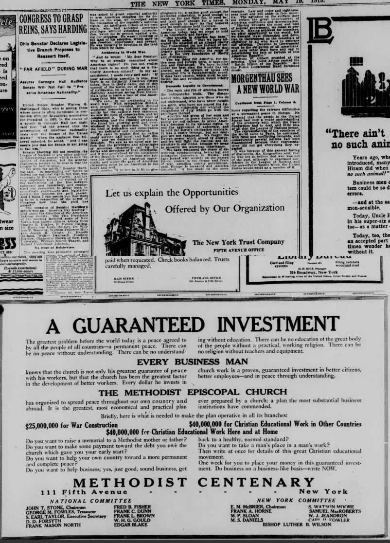 Just days after Reilly returned to London, the New York Times ran an appeal for Reverend Bysshe’s Episcopal Church immediately beneath a report of a speech made by President Harding at the Carnegie Hall the previous evening. The occasion of Harding’s speech was the American Day Meeting, held under the direction of the American Defense Society. The event had been arranged primarily as a protest at the anticipated spread of Bolshevism throughout Europe and America. [22] The appeal, which ran at a full half-page, was targeted at investors; there could be no lasting peace without understanding, there could be no understanding without education, and there could be no education without a $105,000 cash investment. Another advertisement on the page was for the New York Trust Company whose incoming trustee was Grayson M.P. Murphy.