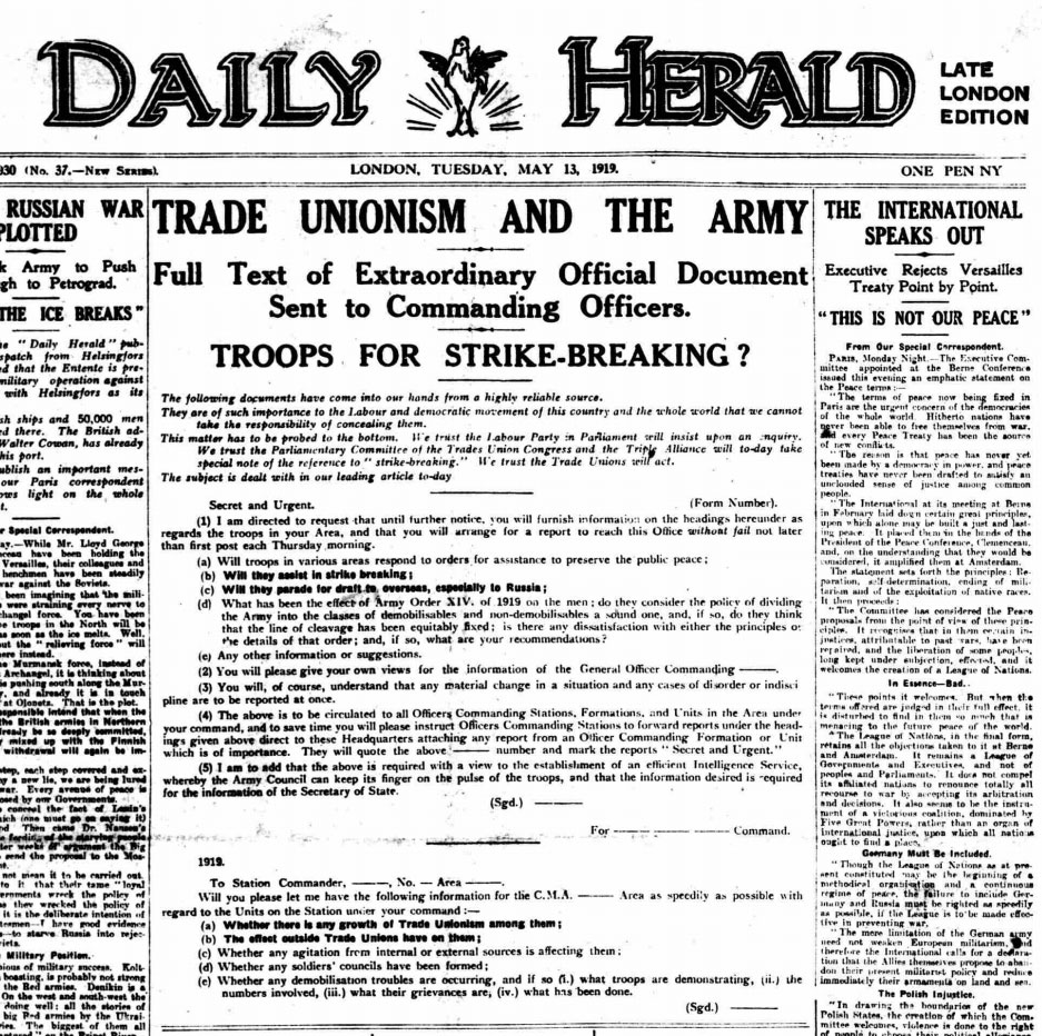 [9] ‘Trade Unionism and the Army’, Full Text of the Extraordinary Document, Daily Herald, No.1,030, May 13, 1919, p.1; ‘Churchill Adamant’, Secret Circular Part of Military Regime: Kolchaks Troops in British Uniforms, Daily Herald, No.1,045, May 30, 1919, p.1