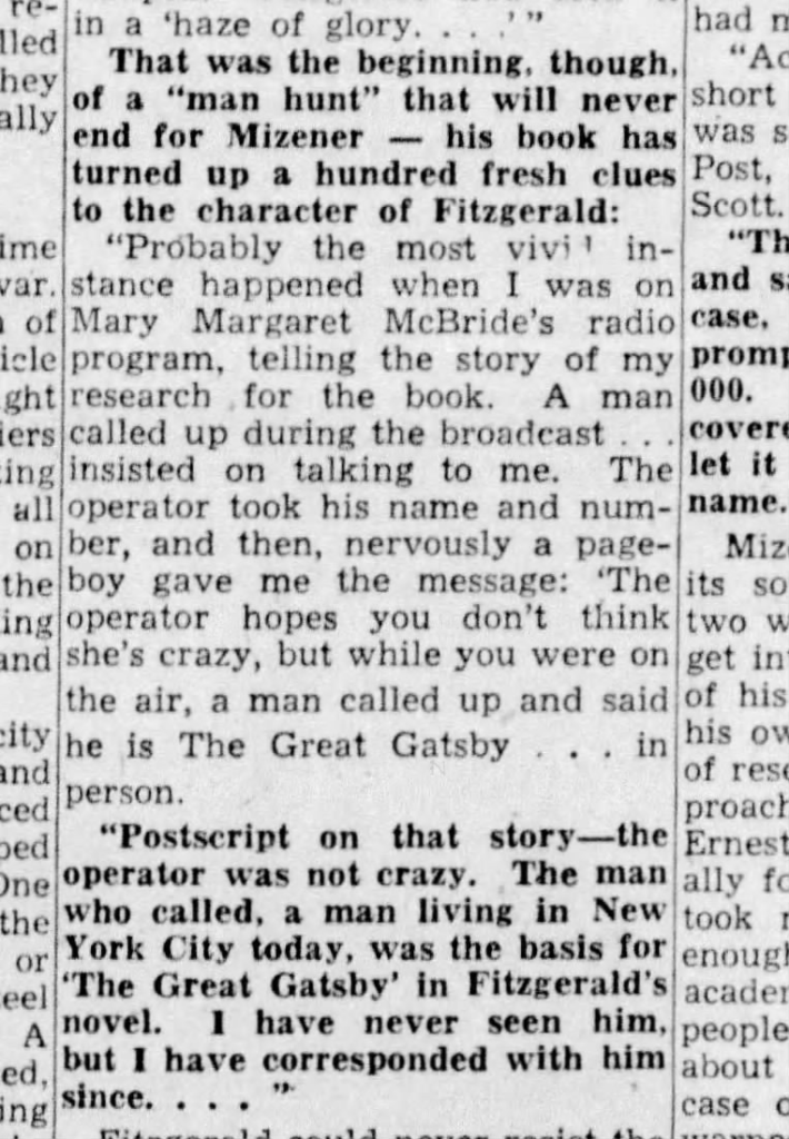 There’s only so many days of the Gatsby centenary to go, so I thought I’d share this: Scott Fitzgerald’s first biographer, Arthur Mizener, talking to Mary Margaret McBride about his new book, The Far Side of Paradise, in January 1951. The book was a milestone in the creation of the Fitzgerald legend and was published almost simultaneously with The Disenchanted from Budd Schulberg, a fictionalized account of Scott’s final years in Hollywood. To the best of my knowledge, the McBride show featured below has not been heard for almost 75 years.