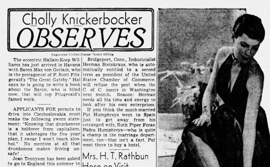 We don’t really know a great deal about Gerlach. We know that he managed a Speakeasy for Arnold Rothstein next door to the Plaza Hotel on West 58th Street — where several critical scenes in the novel are set — and we know that he adopted the mannerisms and dress code of an Old World aristocrat. [5] We also know that for the best part of fifty years, Gerlach had been making regular trips to Cugat’s hometown of Havana. According to a story published in the San Francisco Call in April 1950, ‘Baron Max von Gerlach’ had arrived in Havana, Cuba with “the eccentric Hallam Keep Williams”. Despite the report being no more than 40 words in total, the newspaper had a bombshell claim: the 65 year old Gerlach had been the original inspiration for the hero of The Great Gatsby and Williams was going to write a book about the Baron “that would top Fitzgerald’s famed work”. [6] Just a few years earlier, Zelda Fitzgerald had told Princeton scholar Henry Dan Piper that a man they had known as “von Guerlach” had been the inspiration for the novel’s hero. [7] According to research by Professor Horst Kruse, Gerlach had first arrived in Cuba in 1906 and returned to the country at intervals for the remainder of his life.