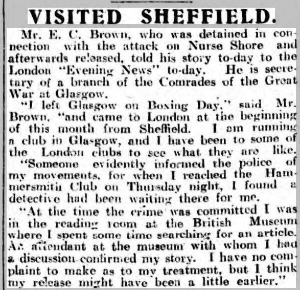 The final irony is that it was the Reading Room at the British Library that proved so central to Ernest Brown’s alibi. The room’s status in all manner of spy capers is legendary and his story regarding his alibi is confused to say the least. In the Canton Daily News article of 1926, Brown tells F. Gregory Hartswick that he was cleared of any involvement in the Shore Nightingale murder as a result of a time stamp on a Reading Room permit stub. However, in an interview he gives to the Sunday Post dated January 18th 1920, Brown claims he had been released solely on the word of a Reading Room attendant, who had some vague recollection of Brown visiting the room that week. Brown states unequivocally that the stub he had retained from his reading room session had NOT been dated (Mr Brown’s Alibi, Sunday Post, 18 January 1920, p.2). Sadly, Brown was released from custody on the very day that Shore succumbed to her injuries. Any chance of a positive ID from the victim was gone. Florence had died without regaining consciousness.