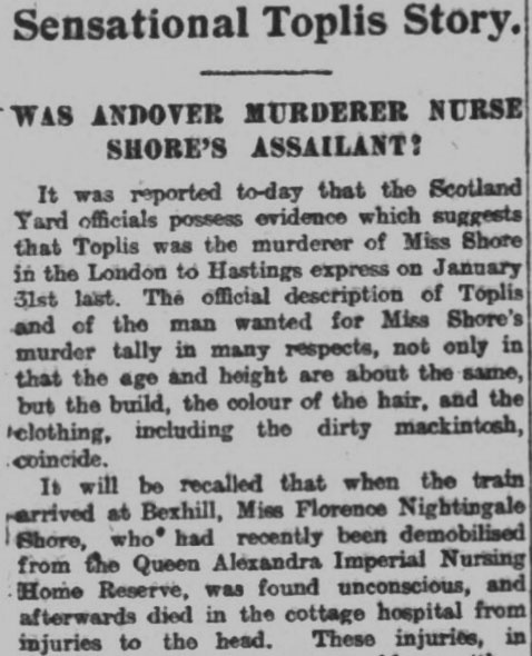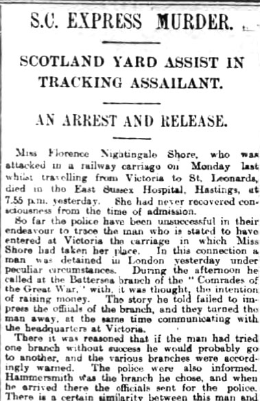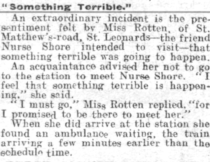 An extraordinary incident is the pre-sentiment felt by Miss Rotton, of St Matthew’s Road, St Leonards — the friend Nurse Shore intended to visit — an acquintance advised her not to go to the station to meet Nurse Shore. “I feel that something terrible is happening”, she said … When she did arrive at the station she found an ambulance was waiting.