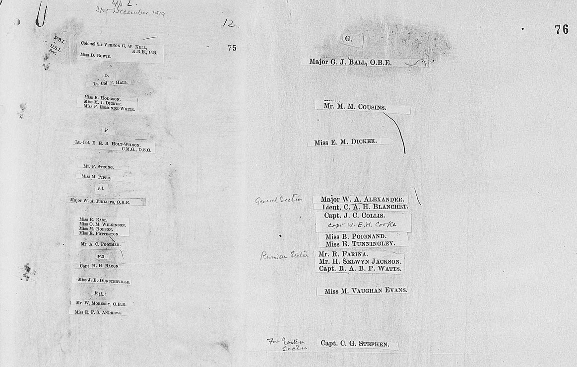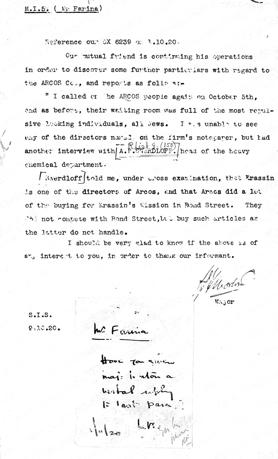 The type-written letter in the picture below sees Desmond Morton of Mi6 discussing the formation of Krassin’s All Russian Co-operative Society with Florence’s cousin in October 1920. Other files indicate that Farina was working at the Russian Section of Mi5 as early as August 1918, when he was attached to G4 branch, a small but rapidly expanding team of four officers and four secretaries tasked with putting together a blacklist of Russian émigrés (KV 2/568 – KV 1/44, National Archives). Farina wasn’t to know at this stage that several of these émigrés were just yards from where his cousin Nurse Shore was heading on the day she was attacked.