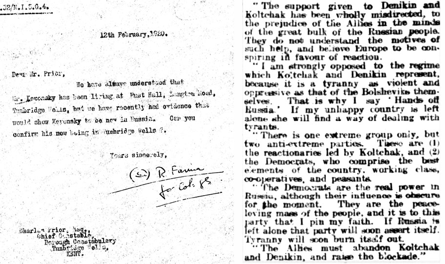 At the top of Farina’s list is former Prime Minister Kerensky, the Socialist Revolutionary who led Russia’s Provisional Government in the six month interval between the February and October Revolutions in Russia. For two years Kerensky has been in hiding. Now he is in Tonbridge with his friend and translator Dr. Gavronsky. This placed him and his revolutionaries within 30 minutes or so of Florence and her aunt, the Baroness Farina on Hadlow Road. Mi5 were of the opinion that Kerensky was working with the Germans to influence Russian public opinion against the White Russian movement.