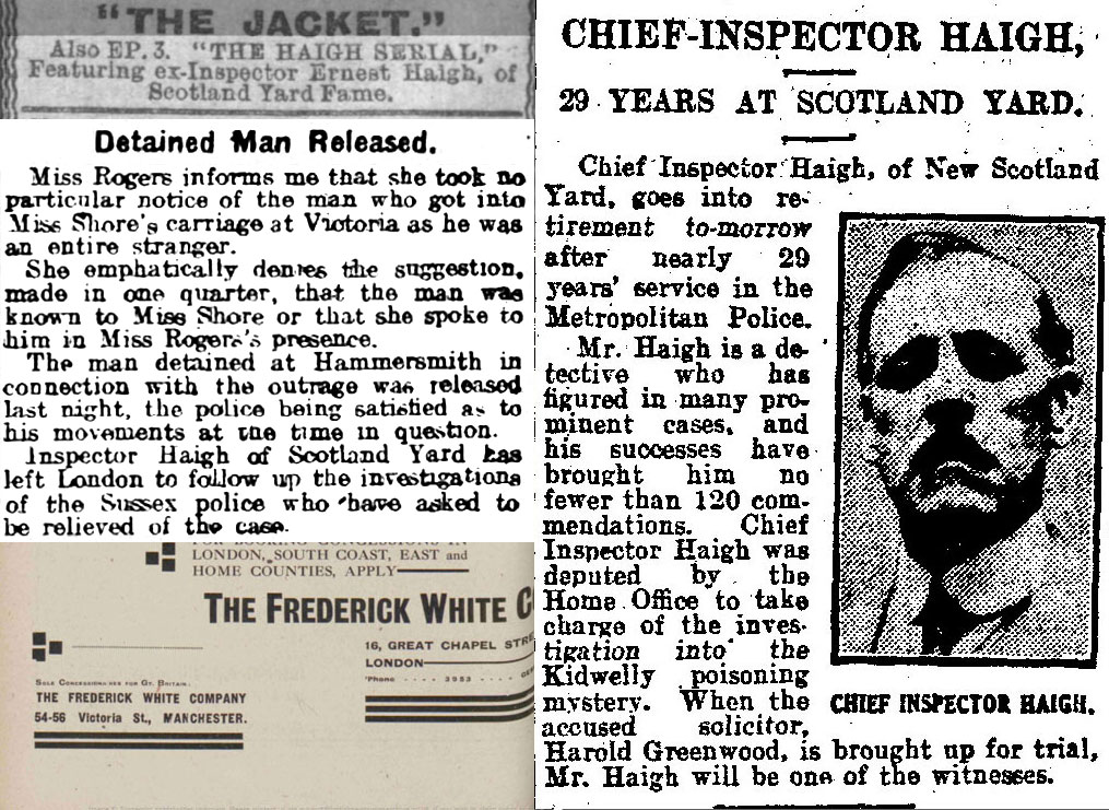 Sadly, answers to many of these questions are likely to remain unanswered. Within 48 hours of the attack on Nurse Nightingale Shore, Ernest Haigh, Chief Inspector at Scotland Yard was deputed by the Home Office to take control of the case. The investigation was being led not by Hastings Police but by CID at The Met. It was the second time that year that the Home Office had Chief Inspector Haigh intervene in a high-profile investigation — the first being the case against Harold Greenwood, the Solicitor from Llanelly in South Wales accused of poisoning his wife Mabel, the sister of Sir Thomas Vansittart Bowater, Conservative MP and five-time Mayor of London. It was a sudden intervention and came several months after Greenwood’s arrest (Dundee Courier 09 June 1920, p.6)